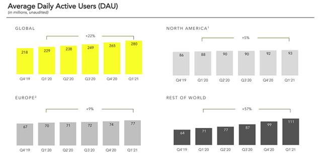 While Snapchat usage increased in all regions, the app saw its biggest growth in the ‘Rest of World’ segment, which is largely due to the company’s ongoing investment in more localised content and improved language support options.